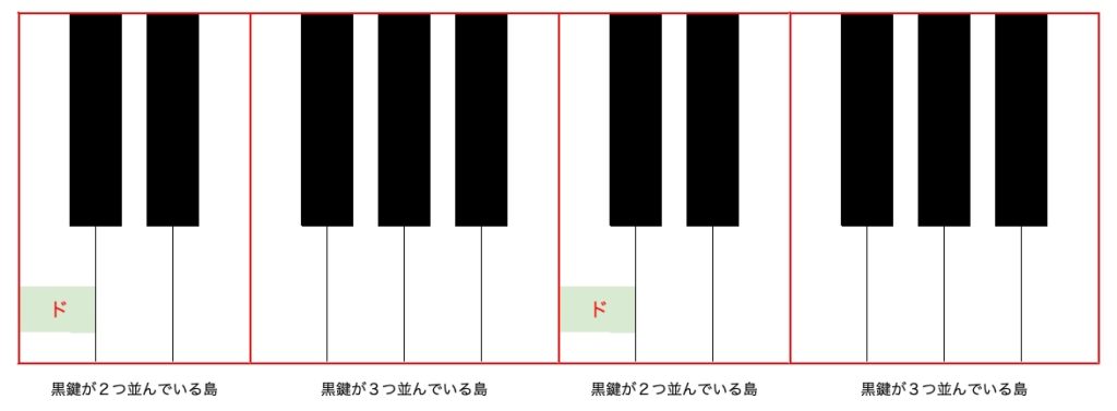 ピアノを全然触ったことのないのために少し補足をすると、以下の図のようにピアノは黒鍵が2つ並んでいる島と黒鍵が3つ並んでいる島が交互に並んでいるものと捉えるとわかりやすいかもしれません。