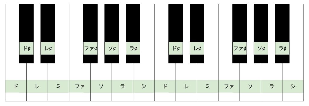 つまり、この黒鍵の音はドの音よりも半音高いド♯と表現する場合もあれば、