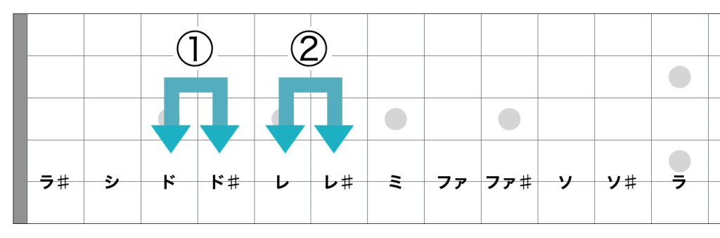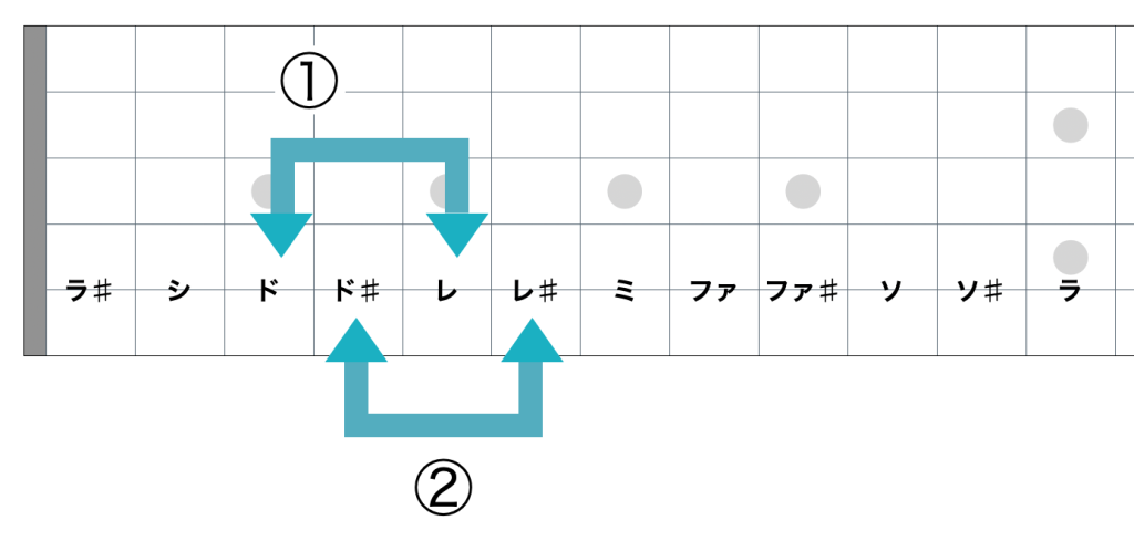 ギターで説明すると、以下の①②のように『となりのフレットにある音は全て半音の距離』となります。