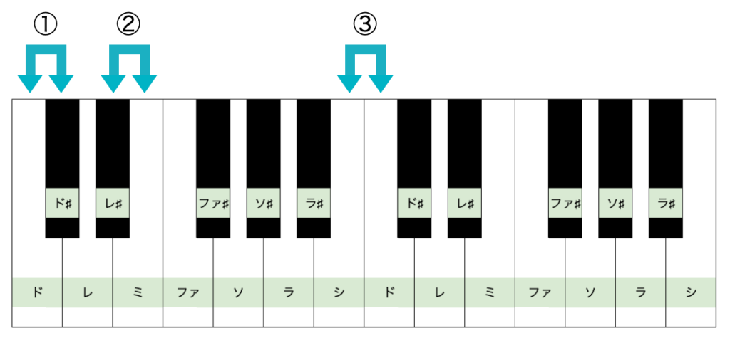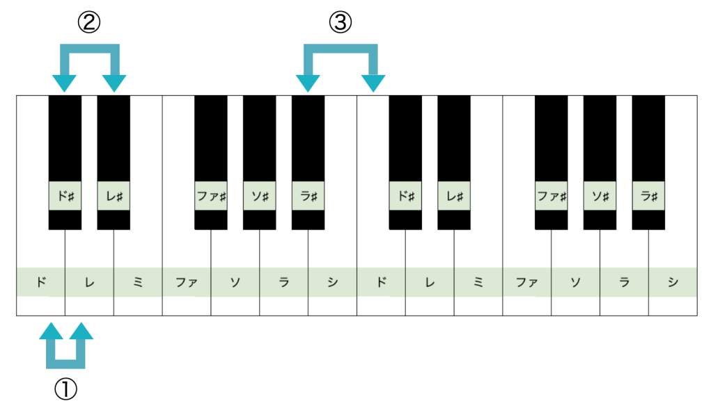 図を使って説明すると、白鍵黒鍵関係なく、となりの鍵盤であれば以下①〜③すべてのパターンで半音の距離となります。