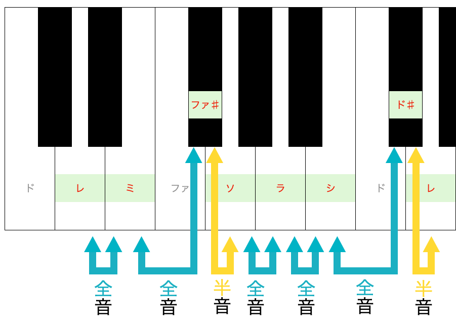 例えばドの音の右隣の白鍵であるレの音から全・全・半・全・全・全・半という規則で音階を作ると、以下の図のようになります。