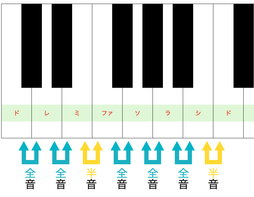先に結論を言うと、ドレミファソラシドはメジャースケールの1種であり、その正体は全・全・半・全・全・全・半です。
