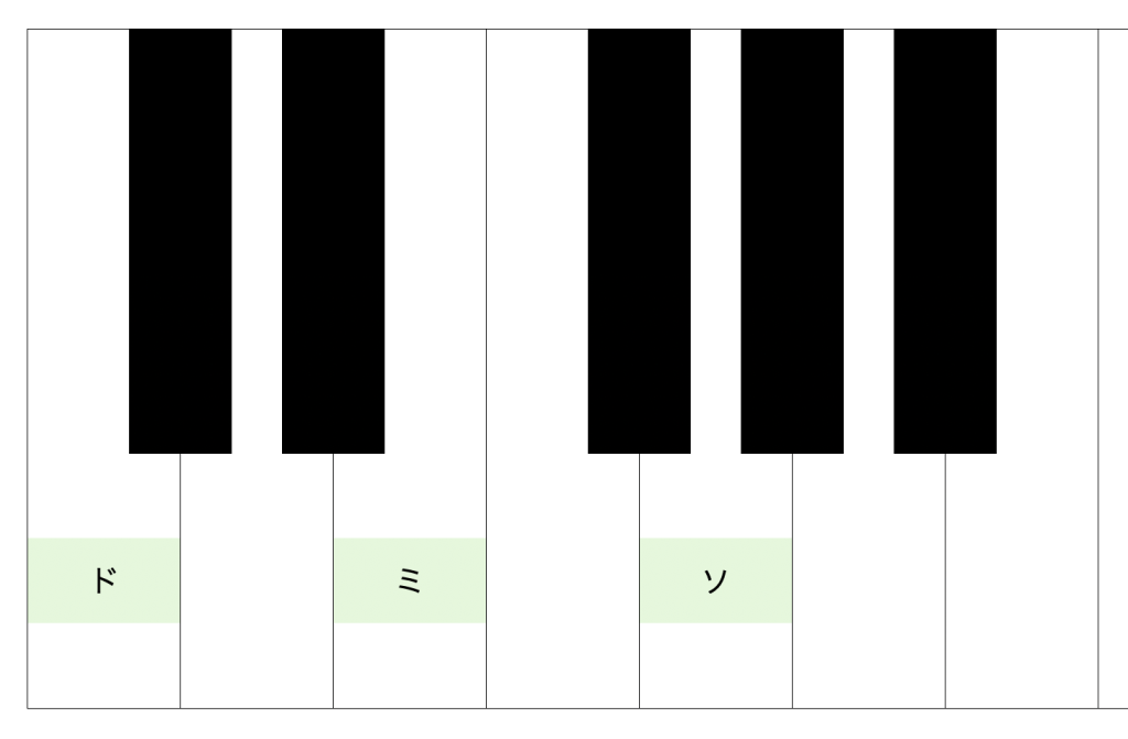 具体的な話をすると、ピアノで以下のように「ド・ミ・ソ」と3つの音を同時に弾いたとき、「Cメジャーコード」と呼ばれるコードになります。