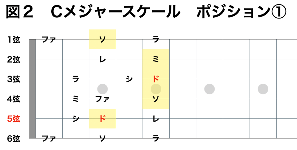 そして、今回5弦ルートのコードを分析する際には、以下のCメジャースケールのポジション①を使用します!