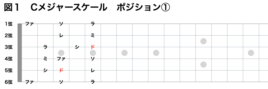 まず、これまで覚えてきたCメジャースケールのポジション①は以下図1でした。