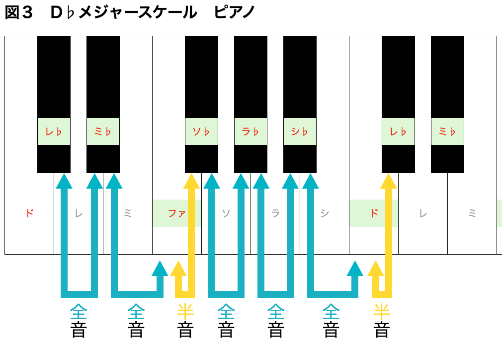 そして、主音(スケールの始まりの音)がレ♭なのでこのスケールはD♭メジャースケールとなります!