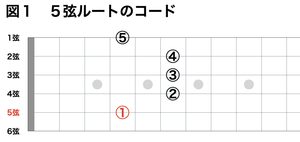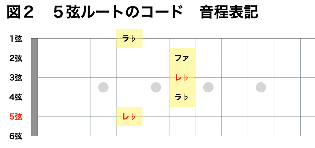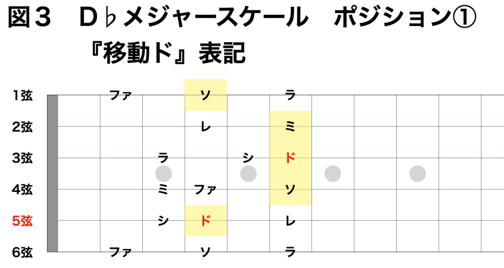 このポジション①をドの位置が5弦の4フレット(図1の赤字①)に来るように並行移動すると・・・以下図3が出来上がります。